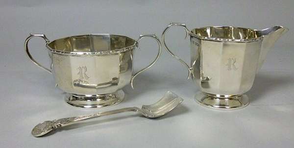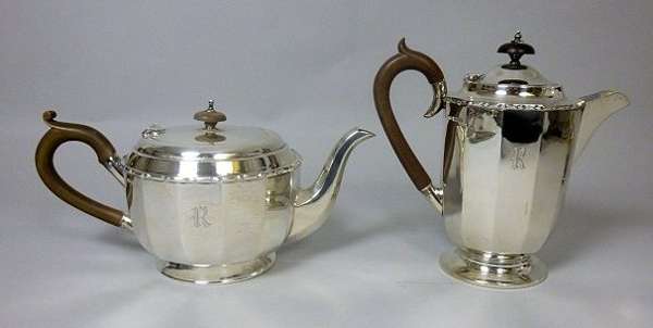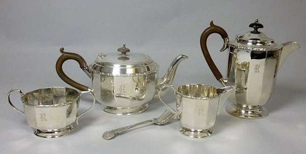 George Wish, Sheffield 1930, comprising a tea-pot, water pot, sugar bowl and milk jug, of plain panelled design, to a swept circular foot, with engraved initial 'R'; together with a sugar spoon (5)