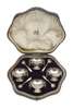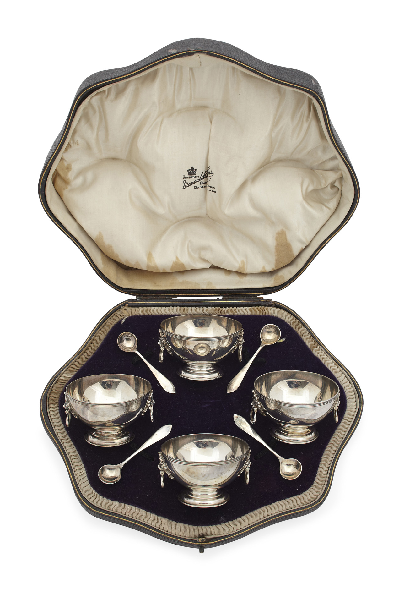 London 1915, of hemispherical form with twin lion mask handles and spool foot, with matching spoons, in fitted case