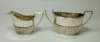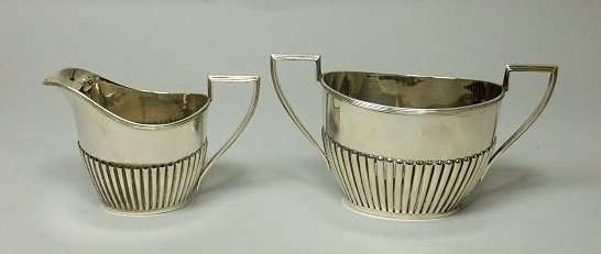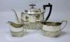 Walker & Hall, Sheffield 1922, comprising a tea pot, milk jug and sugar bowl, each of oval outline with reeded detail to lower body, with angular C scroll handles (3)