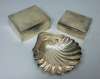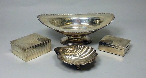 London 1912, of simple oval form with beaded rim, raised on a short stem and foot; together with a modern shell butter dish and two table cigarette boxes
