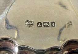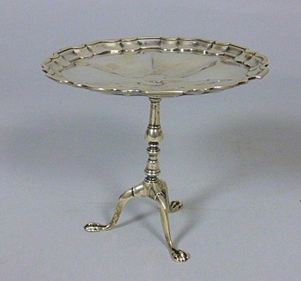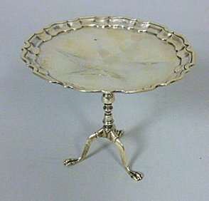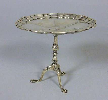 Goldsmiths & Silversmiths Company, Sheffield 1908, in the form of a George II tea table with scalloped rim and knopped column raised on tripod supports