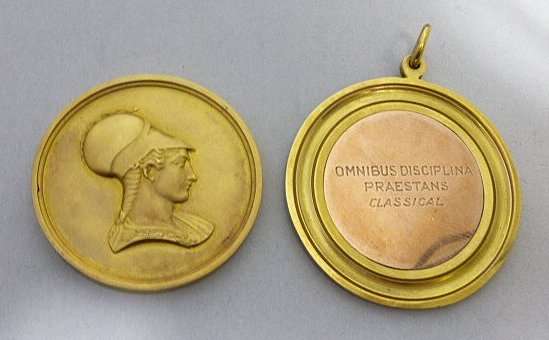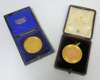 one unmarked, with classical head to obverse and presentation inscription dated 1934 to reverse, in fitted case; together with a school board of Glasgow Girls High School 9ct medallion, hallmarked to central disk, case (2)