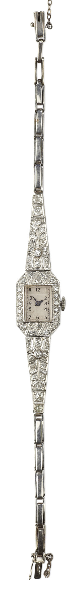 of canted rectangular form, pave set platinum case, tapering diamond set sections to each side, flexible bracelet