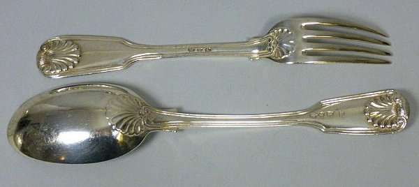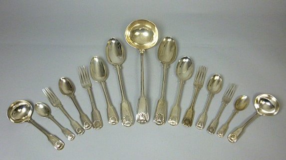 London, the majority 1890, of double struck Fiddle Thread and Shell pattern, comprising twelve tablespoons, eleven table forks, twelve dessert spoons, thirteen dessert forks, eleven teaspoons, a soup ladle, two sauce ladles and a pair of serving spoons (qty)