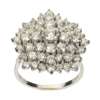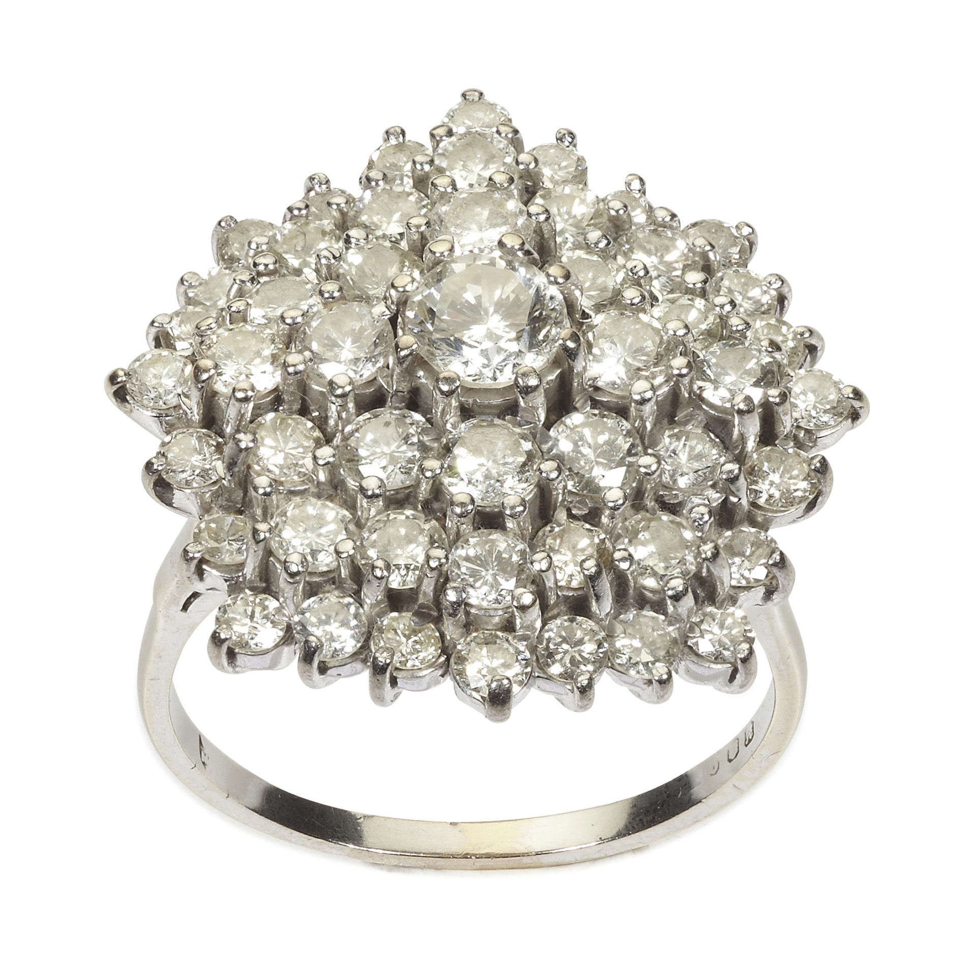 of circular outline, the central round brilliant cut diamond claw set between four radiating diamond set arms, the stepped ground similarly claw set with smaller round cut diamonds