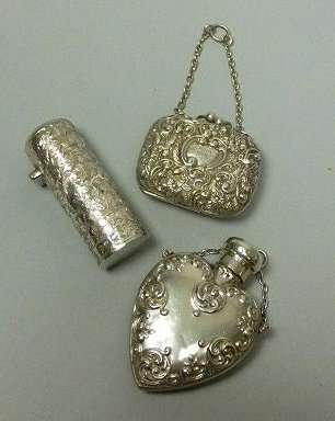 to include a heart shaped scent flask, Birmingham 1898; a small silver purse, of rectangular outline with floral detail, Birmingham 1902; a cylindrical scent bottle, with engraved foliate detail, hinged lid and glass stopper, Birmingham 1896 (3)