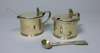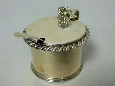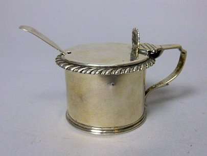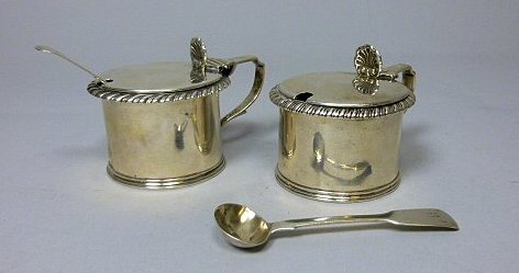 Charles Thomas Fox, London 1831 & 1834, each of plain from with gadrooned detail to rim, plain handles with shell thumb-piece and blue-glass liners; each with a fiddle pattern mustard spoon with engraved 'W' to terminal (4)