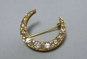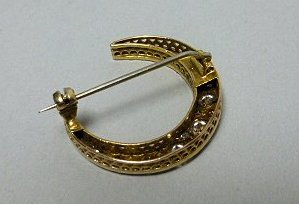 set in yellow metal throughout with graduated round cut diamonds, set between with pairs of diamond chips, with brooch fastening