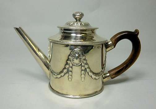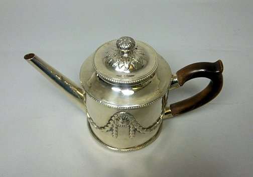 London 1773, of straight sided drum form with embossed acanthus swags and fluted roundels, with straight spout and wooden C scroll handle