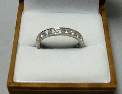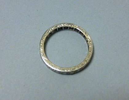 set throughout with round cut diamonds in white metal, the shank with engraved detail to each side, stamped 18ct