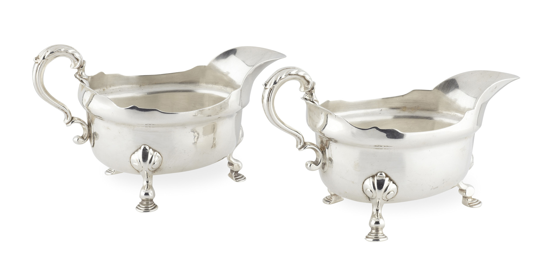 possibly George Boothby, London 1740, of plain design with moulded rim and leaf capped double scroll handles, on three hoot and shell feet (2)