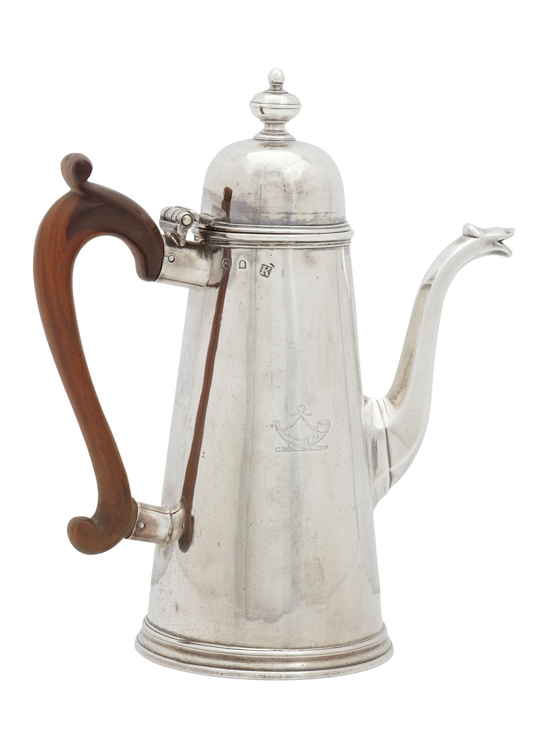 Bowles Nash, London 1725, of flared cylindrical form with engraved crest to body, facetted S scroll spout and domed hinged cover, with S scroll wooden handle