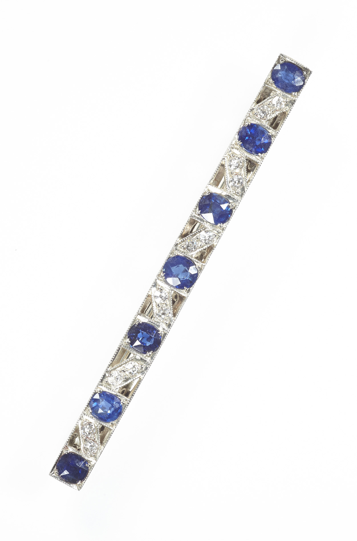 claw set with seven oval cut sapphires between pairs of diagonally claw set old cut diamonds