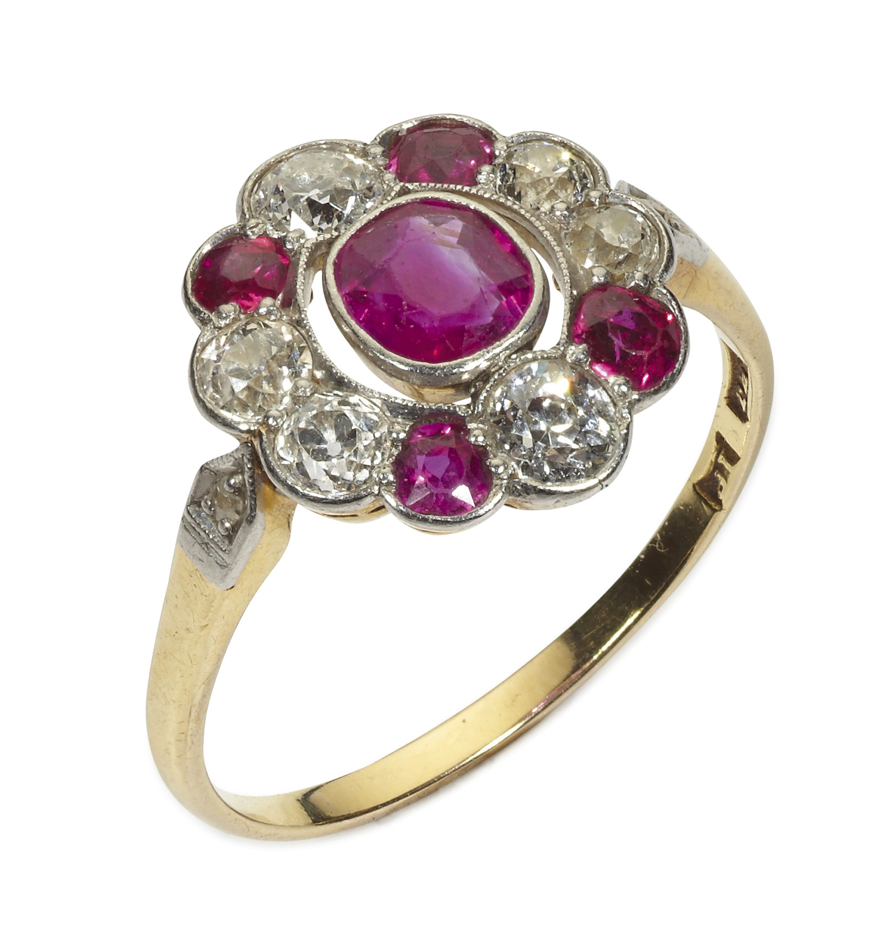 the central cushion cut ruby millegrain set in a single border of similarly set old cut rubies and diamonds, to a plain yellow metal shank