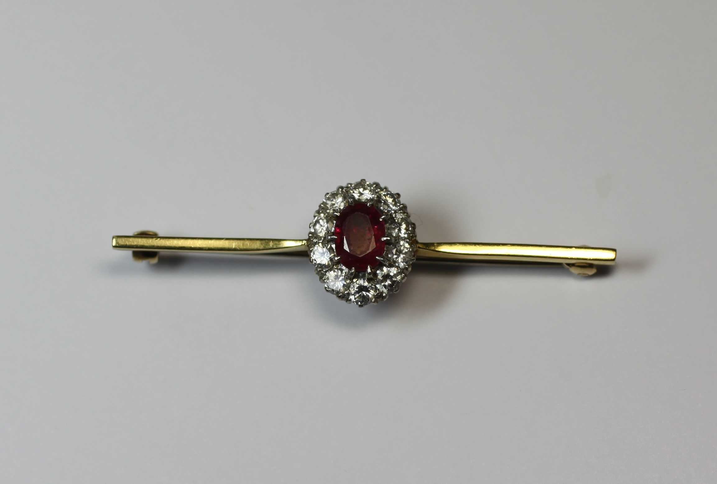 the oval cut ruby claw set in a single border of round cut diamonds, to a plain yellow metal bar with safety pin fastening