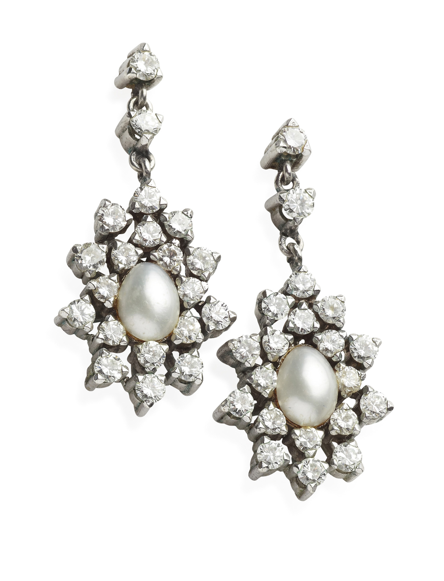 the lozenge shaped cluster composed of claw set round cut diamonds and a central bouton pearl, suspended from two links set with similar round cut diamonds, with post and butterfly fittings