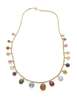 the woven yellow metal chain with multiple graduated drops, each claw set with citrines, amethysts, star sapphires and various other gemstones, to an 's' hook fastening