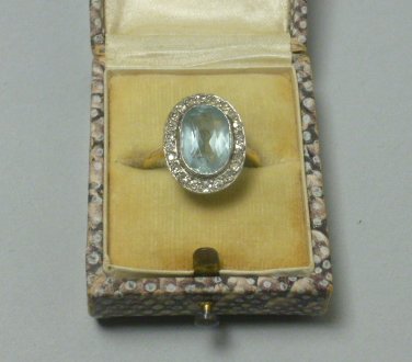 collet set with a oval aquamarine in a single border of claw set old cut diamonds, to a plain yellow metal shank