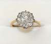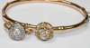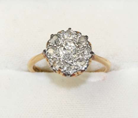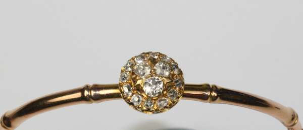 composed of an old cut diamond cluster with central stone flanked by an outer border of similarly cut stones, in 18ct yellow gold shank; together with a similar hinged bangle with bamboo formed hinged hoop set with old cut diamond cluster claw set (2)
