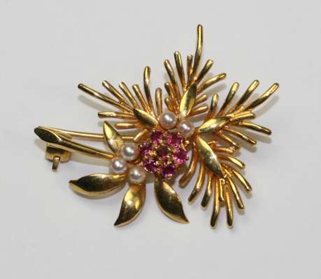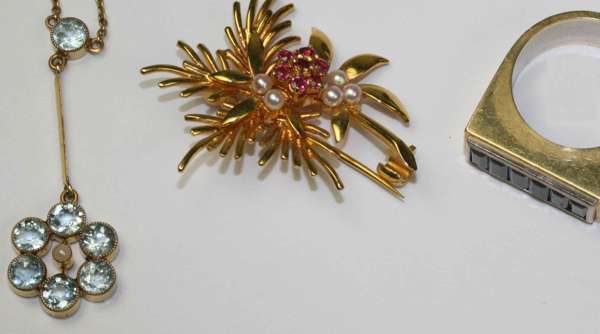 suspended on a fine trace link chain with aquamarine suspension with knife bar suspension to floral cluster with centrally set pearl; together with a modern 9ct pearl and garnet floral spray brooch and a sapphire ring (3)