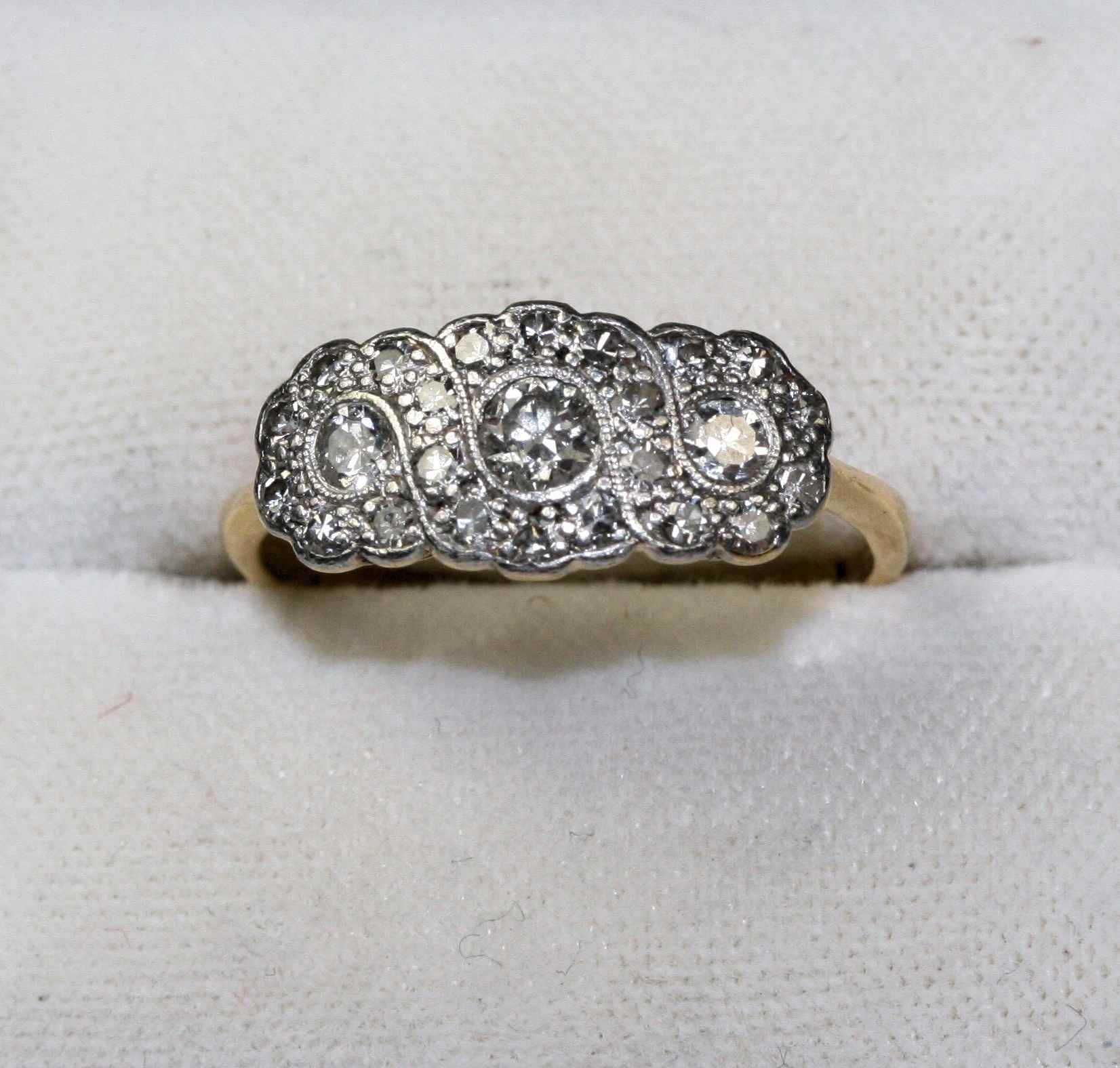millegrain set in white metal with three graduated round cut diamonds, in a scrolling border set throughout with eight cut diamonds, to a plain yellow metal shank stamped 18CT&PT