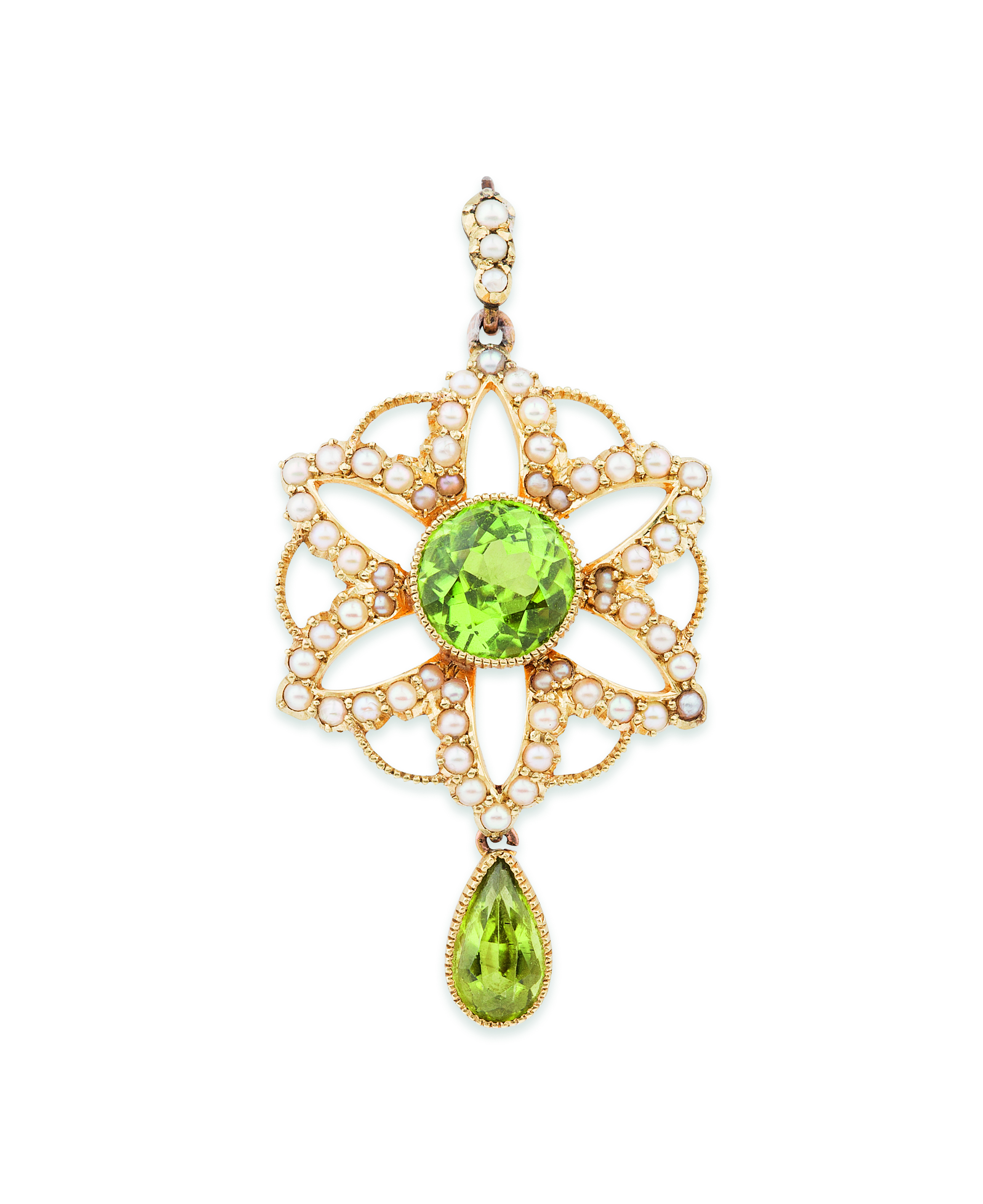 millegrain set in unmarked yellow metal with a round cut peridot in a pierced floral border set with seed pearls, the whole suspending a pear cut peridot drop, the bale also set with seed pearls; in a fitted case signed 'Wilson & Sharp ... 139 Princes Street, Edinburgh'
