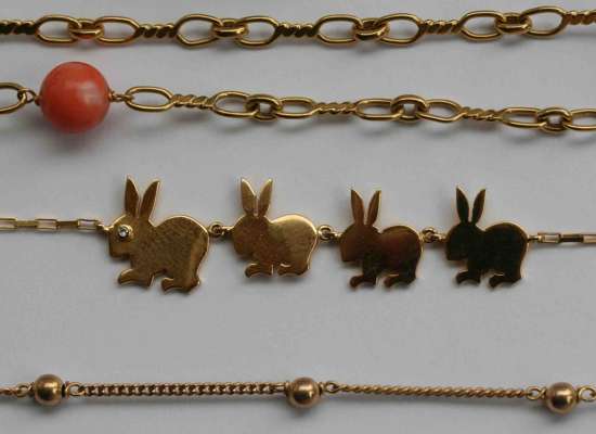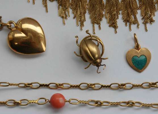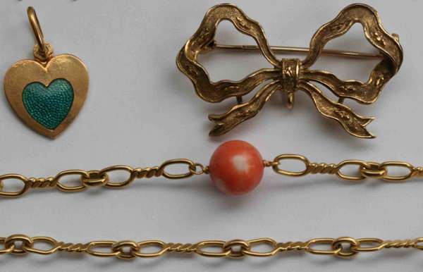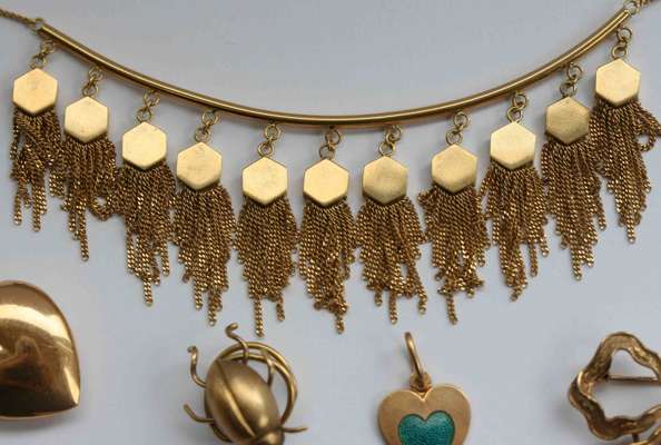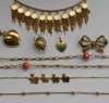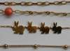 a fringe necklace; a bow brooch; a gold chain set with coral beads, bunny rabbit set chain, bead chain and various other items (qty)