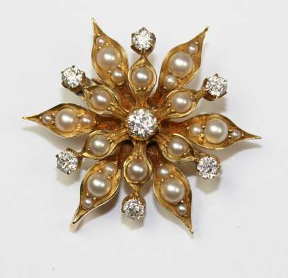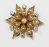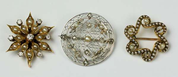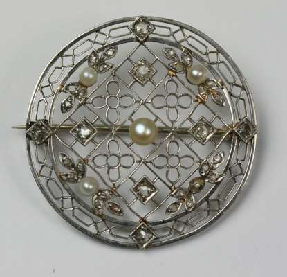 to include a circular pierced white metal brooch, set throughout with rose cut diamonds and seed pearls (engraved number 514); together with another brooch of scalloped circular design, set in yellow metal with small seed pearls; a diamond and pearl set brooch, of floral design set throughout with seed pearls and small round cut diamonds, with pendant suspension (3)