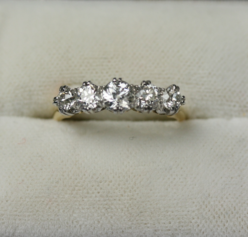 claw set with five graduated round cut diamonds, to a plain yellow metal shank stamped 18ct