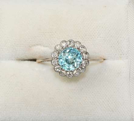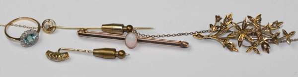 to include a diamond and zircon set ring, the round cut zircon set in a single border of small round cut diamonds; together with an opal set bar brooch; a yellow metal and seed pearl set brooch, designed as a floral spray; two diamond set stick pins (5)