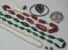 to include; a gold kukri dagger brooch; Scottish shield shaped brooch set citrines, silver filligree necklace; gem set ear studs; silver ear studs; slave bangle; two large strings of Malachite beads; a red hard stone necklace with yellow metal chain links stamped 18k; strings of pearls, lapis and amber necklaces; ivory beads (qty)