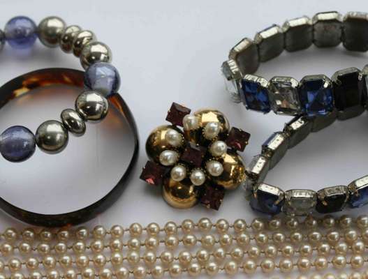 to include various pair of paste set earclips; bangles and cuffs; several torque style necklaces; a quantity of chains, earrings, rings and beads (qty)