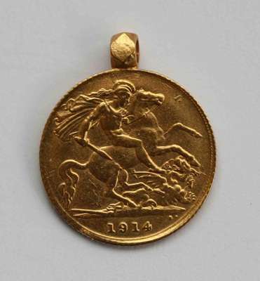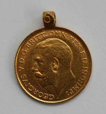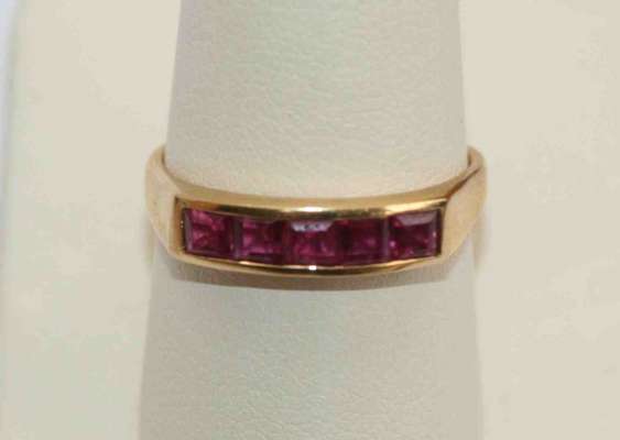 together with a gold ring set with five calibre cut rubies; and a half sovereign (5)