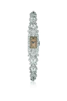 the rectangular dial with Arabic numerals, the head with pave and millegrain set diamonds, tapering diamond set hinged sections to a woven bracelet, case stamped platinum, the movement inscribed Syntax A1