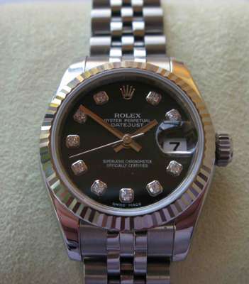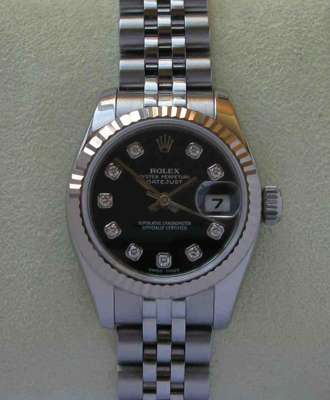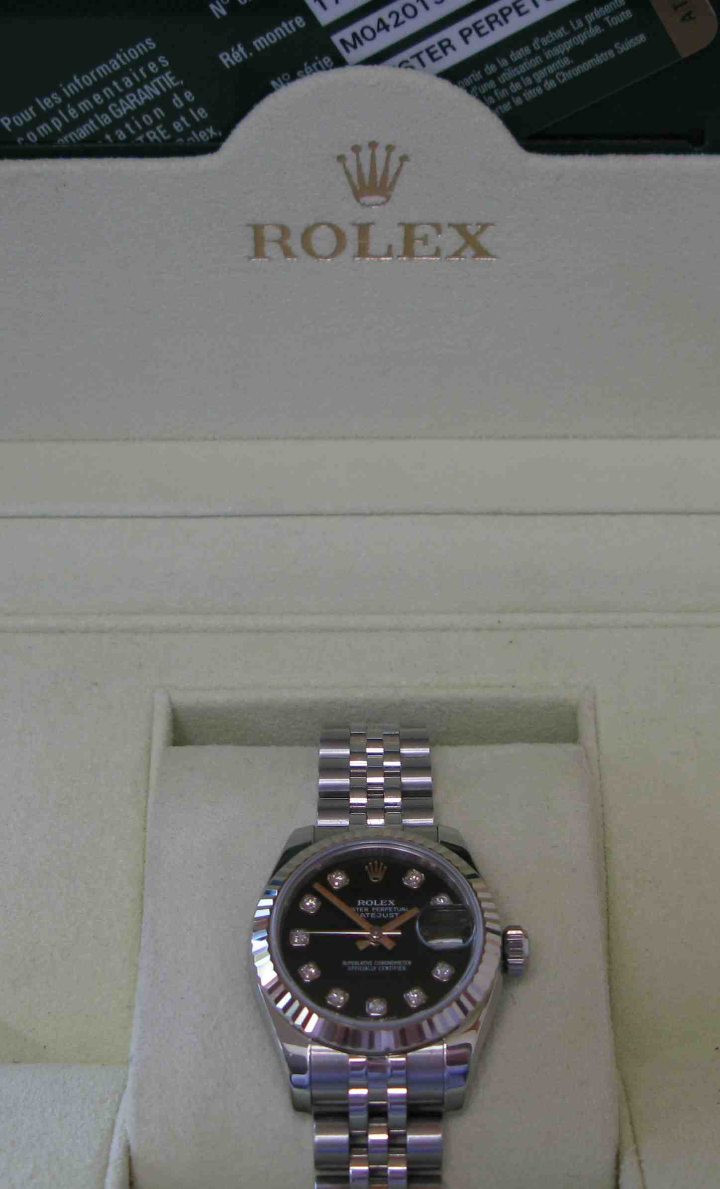diamond set baton numerals, black dial, inscribed Rolex Oyster Perpetual datejust, Superlative Chronometer, officially Certified, date at 3, sweep second hand, serial No. M042019, model 179174 stainless steel case and bracelet, deployant clasp, push button open, screw down winder