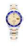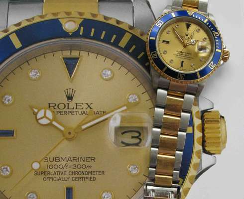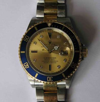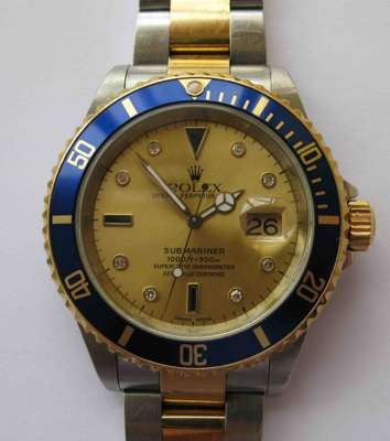gold dial inscribed, Rolex Oyster Day, Date, SUBMARINER 1000ft 30m, Superlative Chronometer, officially Certified, sweep second hand, date at 3, Mercedes luminous hands, sapphires set to 12, 6, 9, small diamonds to the other numerals, blue enamel rotating bezel, serial no. Y515873, model 16613, with a bi-colour flip lock bracelet, triple lock screw down crown, circa 2003-2004