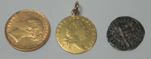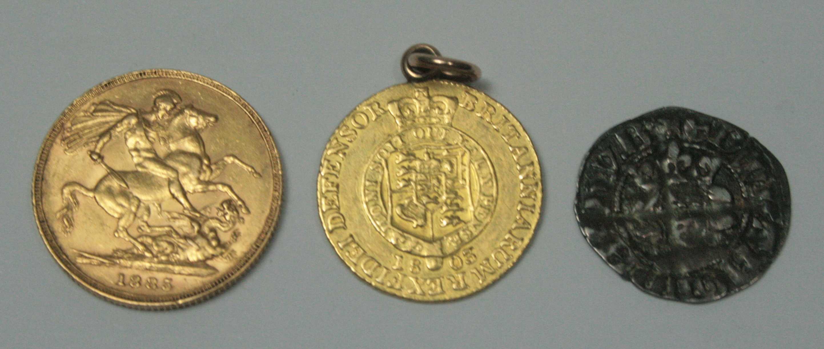 mounted with suspension loop, 1803; a Victorian sovereign 1885 and a Long cross hammered penny (3)