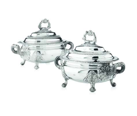 of oval outline with pull off lid, reeded detail to rims, with cast foliate and reeded detail to feet and handles, with engraved crests to body (2)