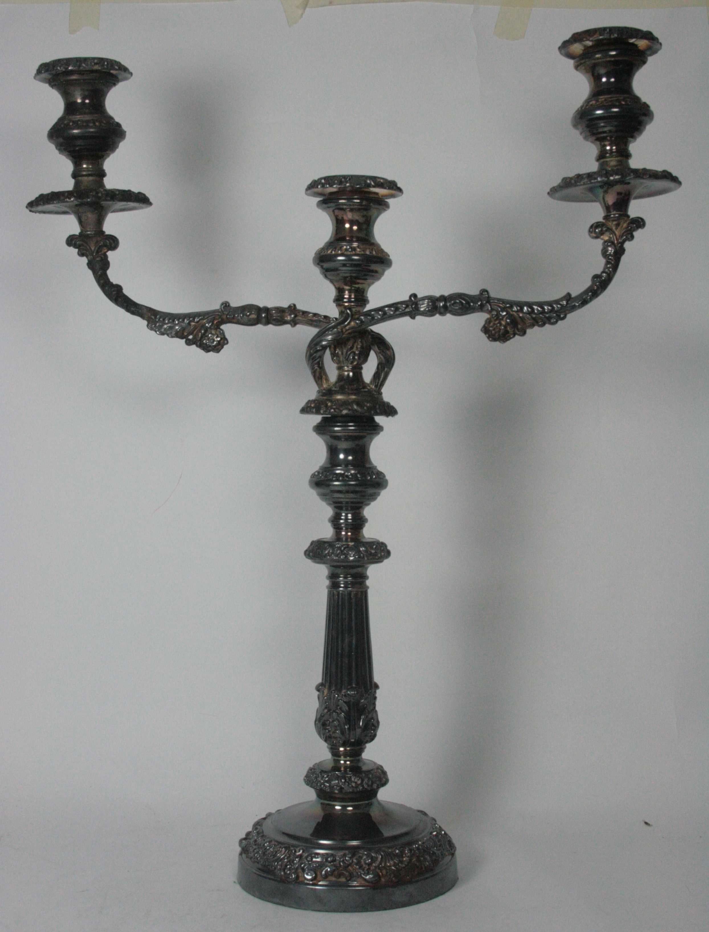 with acanthus clasped fluted columns and raised on a large domed circular base, scroll and foliate border, central sconce and large scrolling arms with foliate details (2)