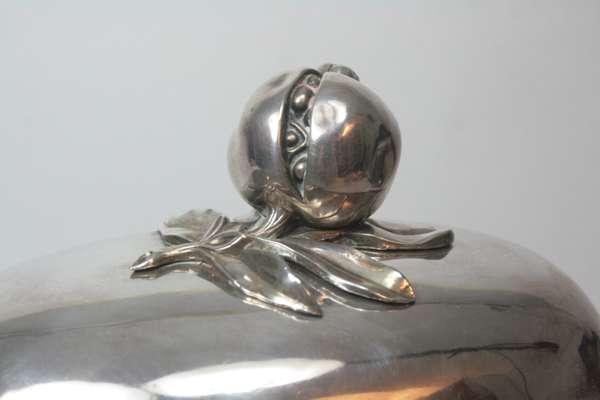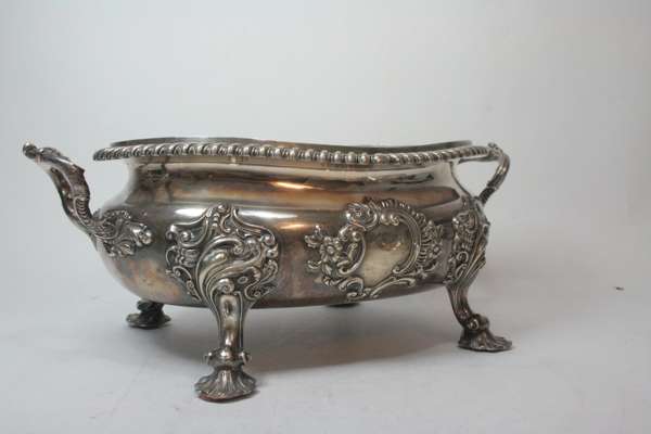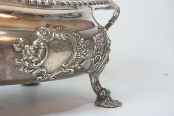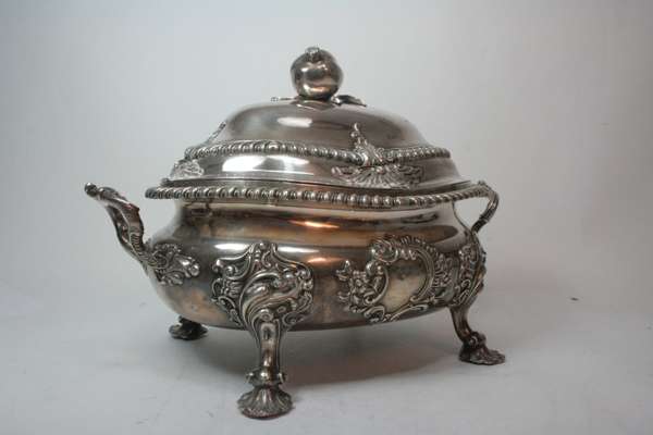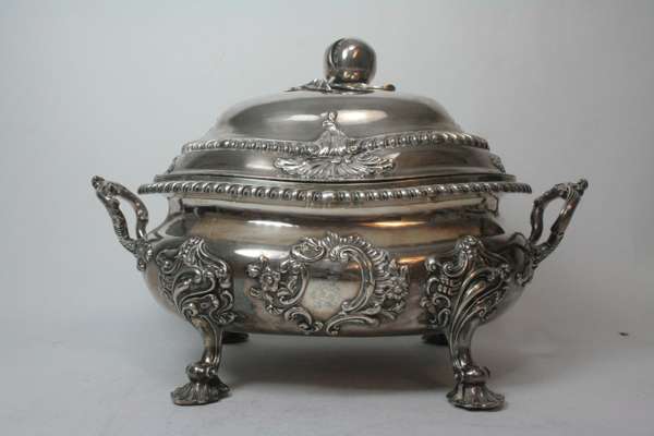 of baluster oval outline, gadrooned rim and scroll formed cartouche, twin reeded handles with shell detail, raised on four scroll capped feet, the domed lift off cover with shell and gadrooned rims and pomegranate finial