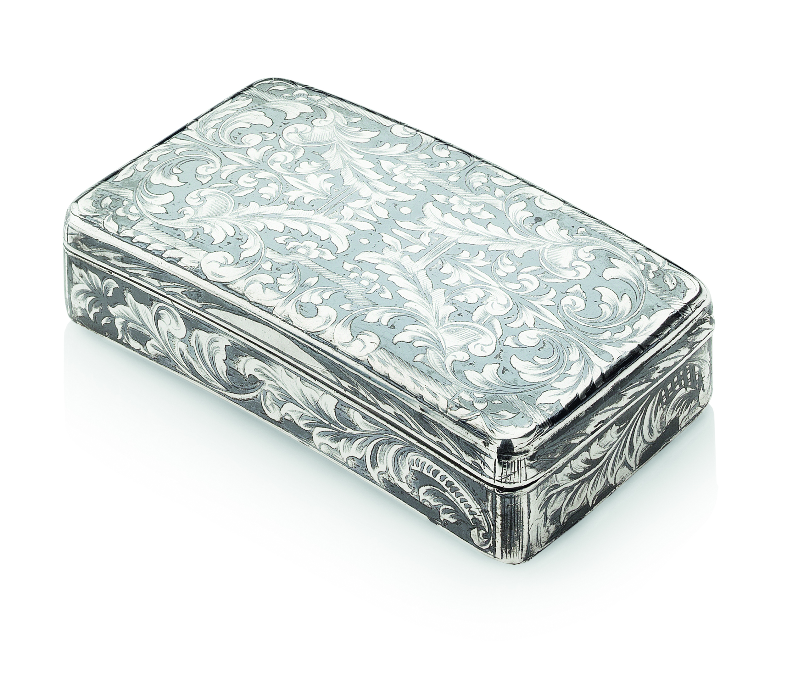 Moscow 1846, of rectangular outline with slightly curved base, the hinged cover, body and base all with foliate niello decoration