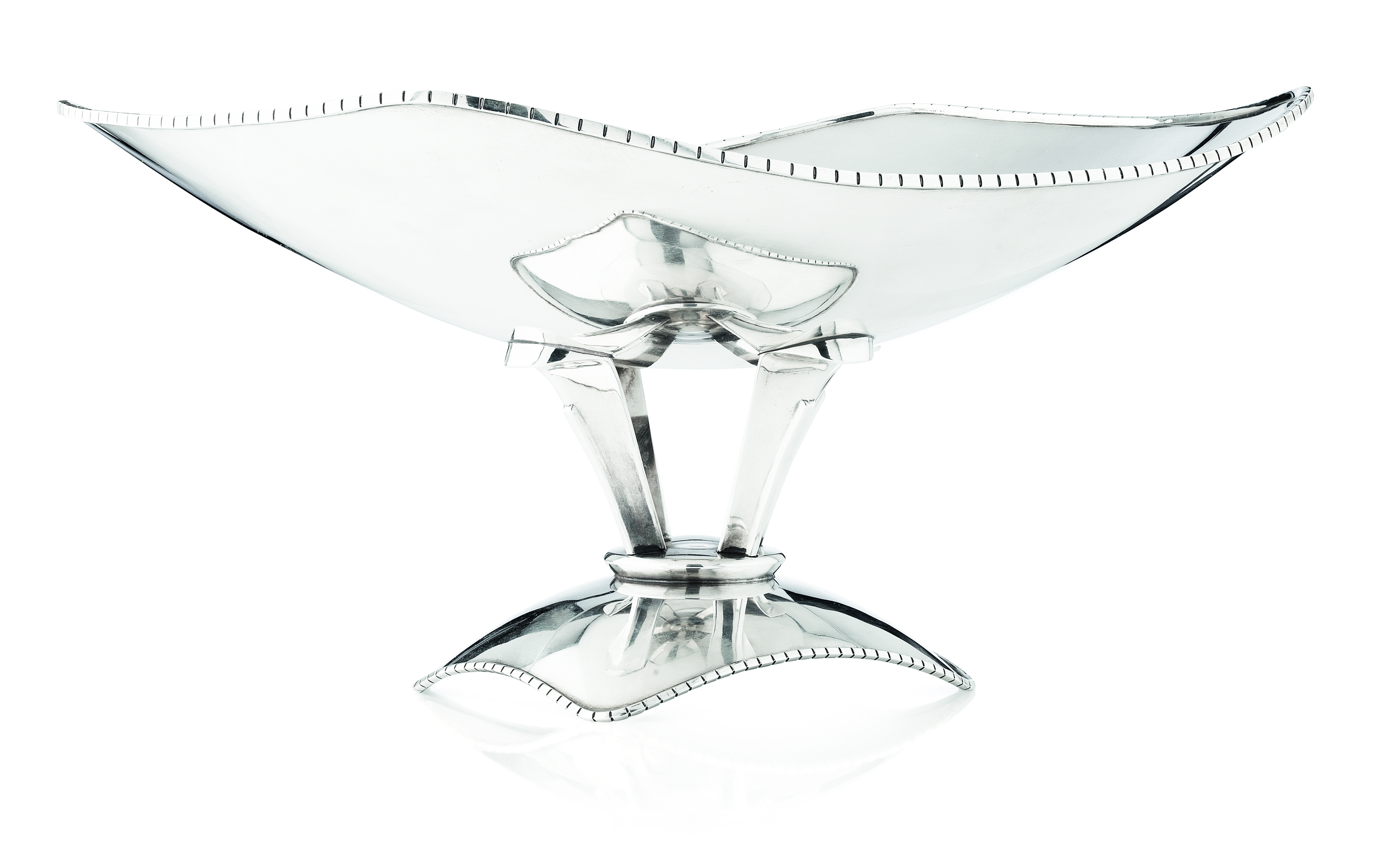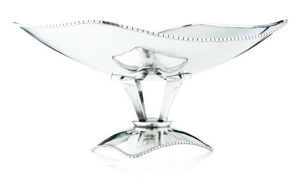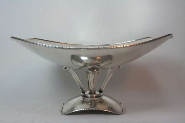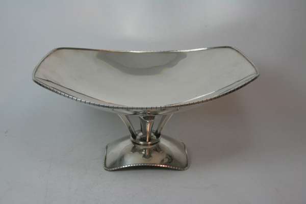 the bowl of flattened rounded rectangular form, the rim with applied square beaded detail; the base with four taper supports to a bowed rounded rectangular foot with similar square beaded detail, indistinct continental marks