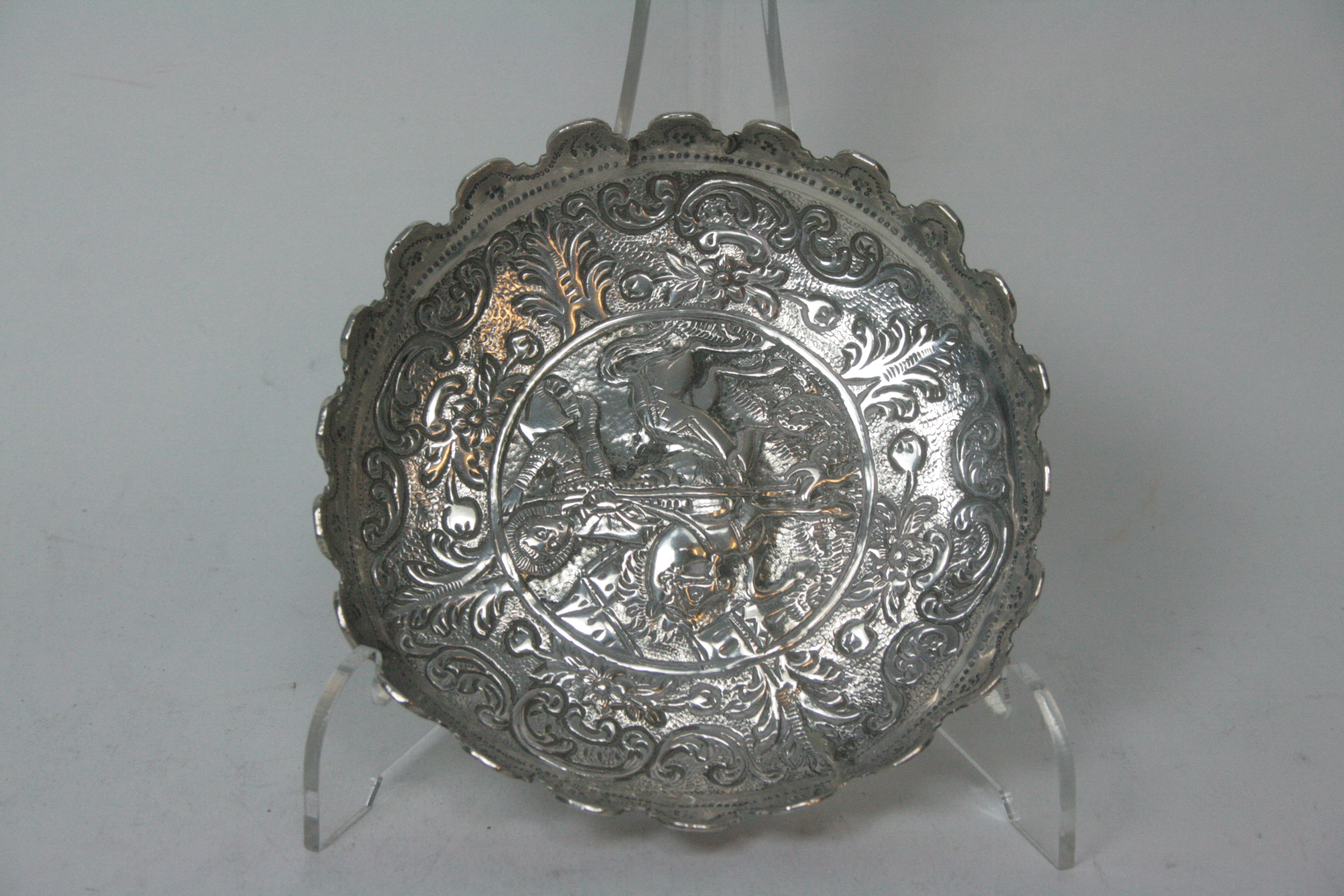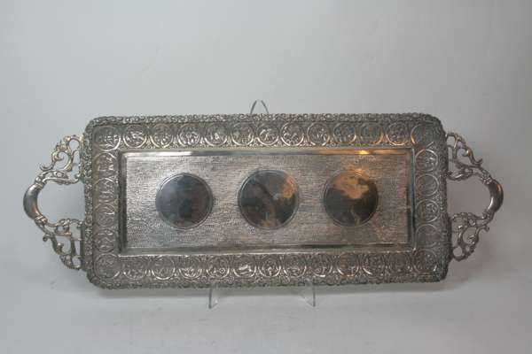 of rectangular outline, decorated with foliate detail, exotic scenes and animals, the twin handles of pierced scrolling design; together with a small circular Indian dish, with scalloped rim and scrolling foliate detail, with embossed detail of a man on a horse, both unmarked (2)
