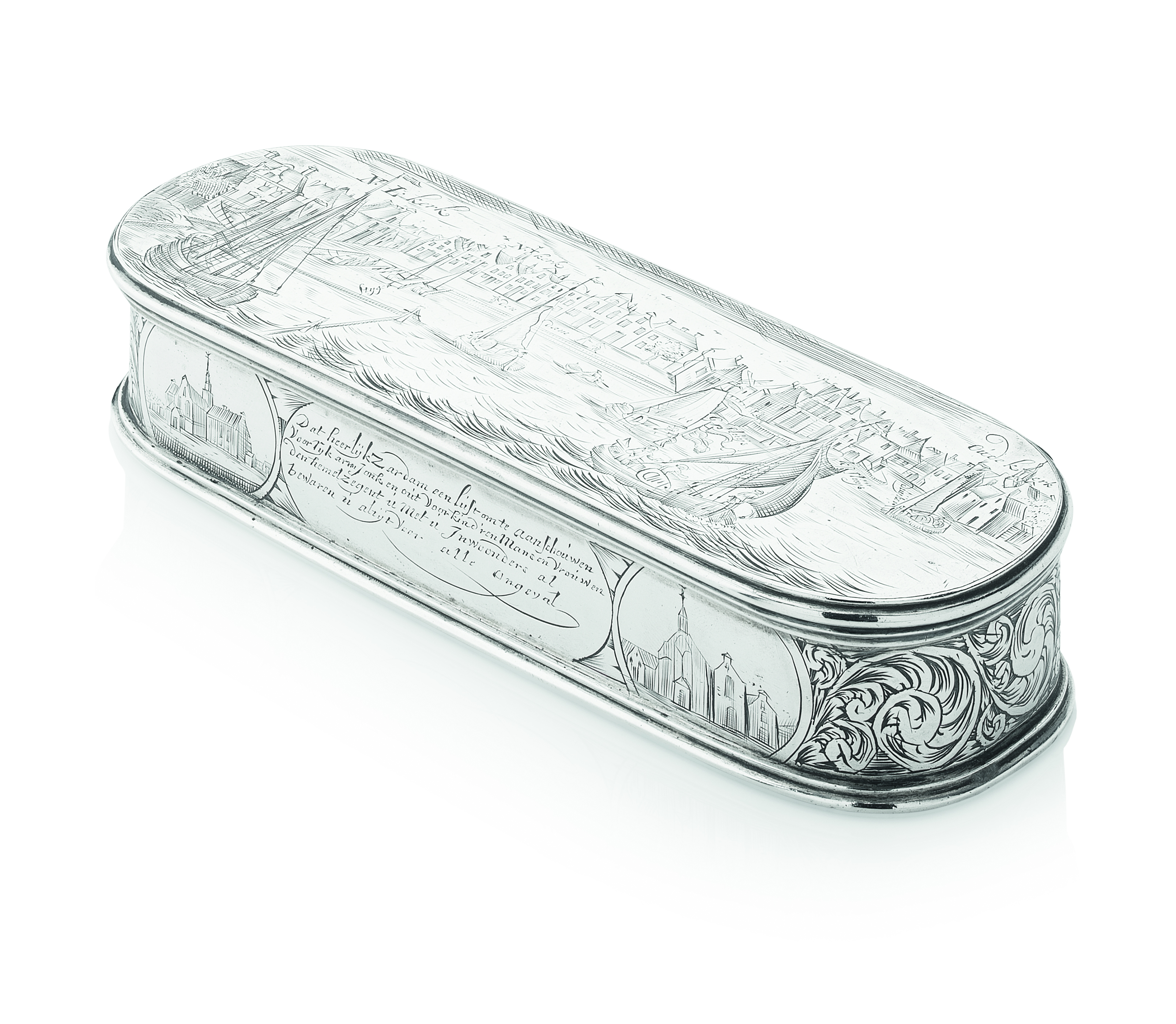 marks indistinct, of rounded rectangular form with engraved detail throughout, the lid depicting a harbour scene with various boats, the base with a ship building scene, and various engraved inscriptions and decorative scenes to sides