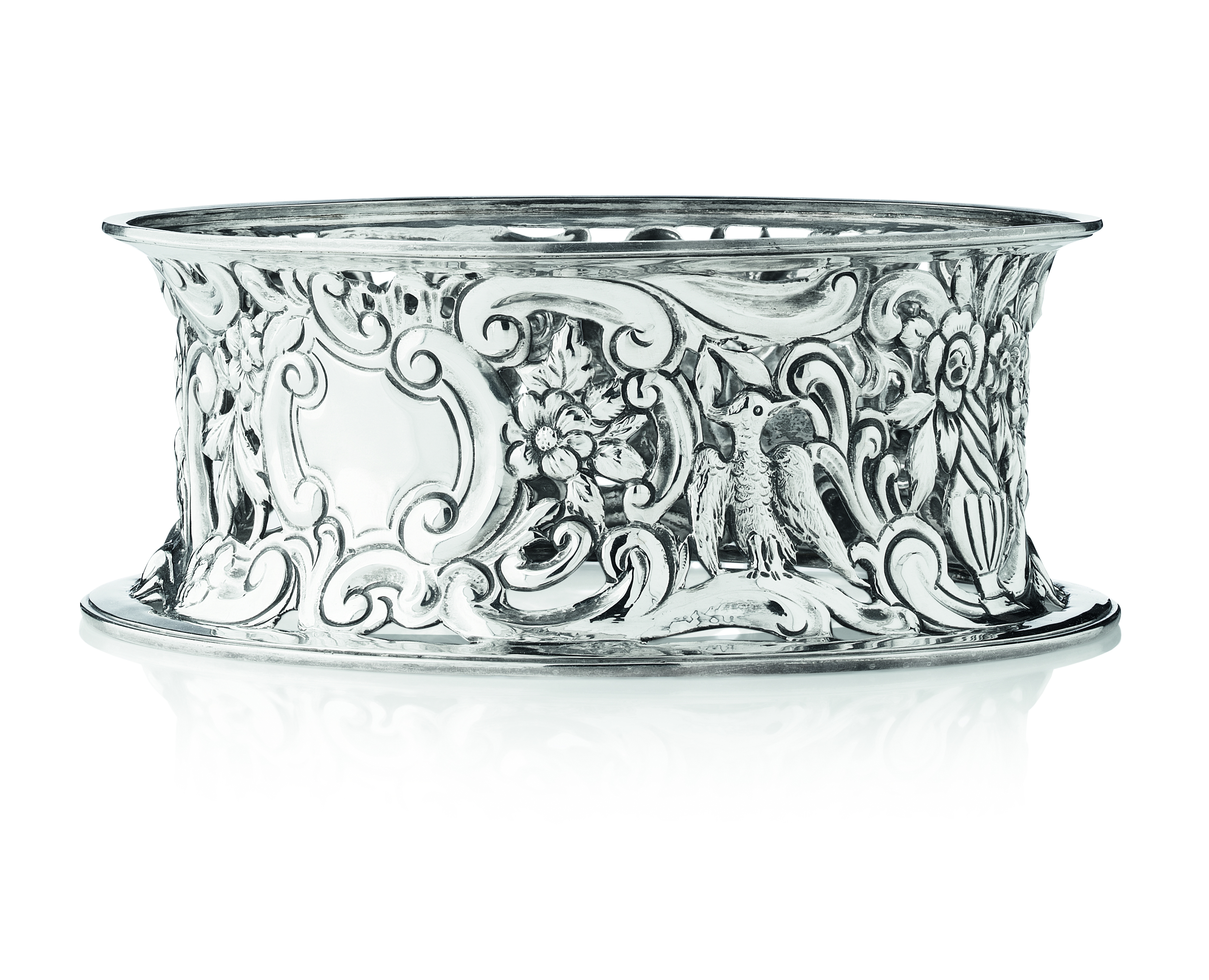 J Parks & Co, London 1914, of traditional form, with pieced foliate and bird detail, two cartouches one engraved with script initial 'G'