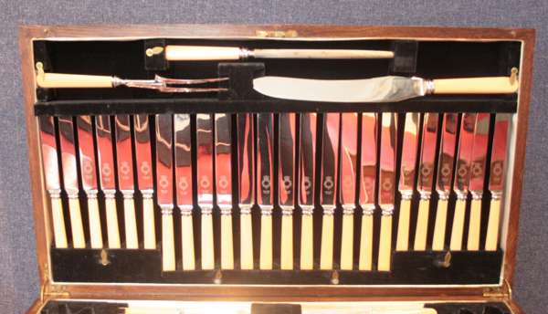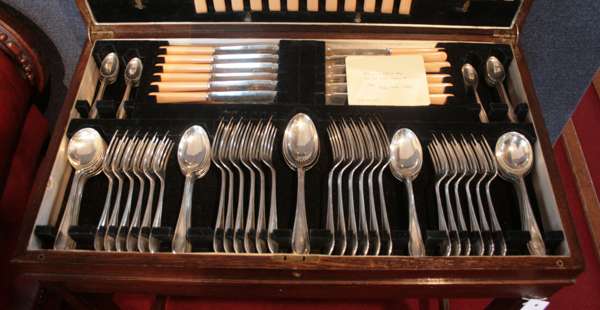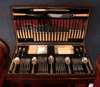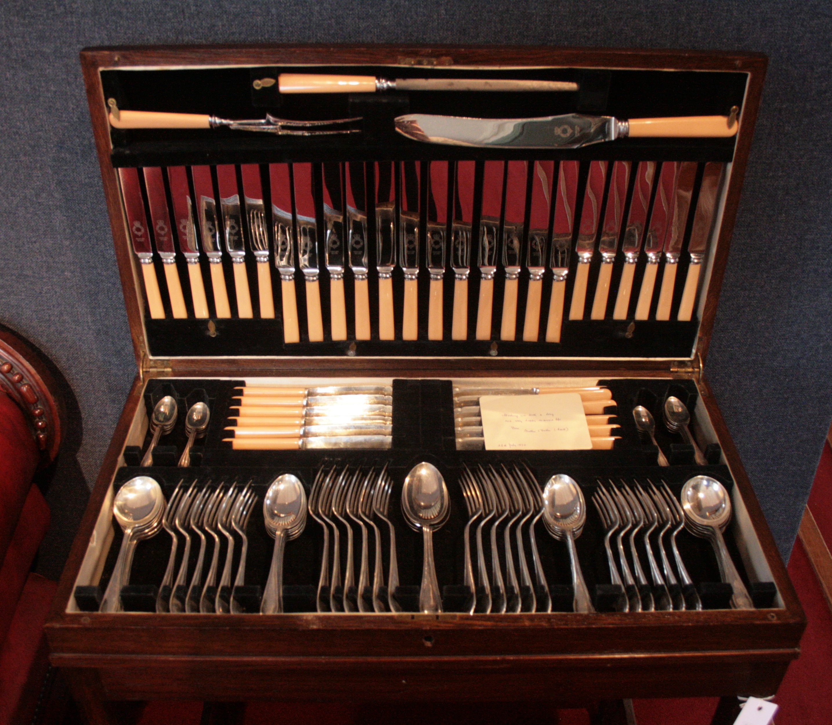 Viners, Sheffield 1936, for twelve covers, comprising table forks, dessert forks, dessert spoons, soup spoons, teaspoons, coffee spoons, fish knives, fish forks, four tablespoons, carving set and ivorine handled table and side knives, housed in a wooden canteen on legs with hinged lid