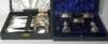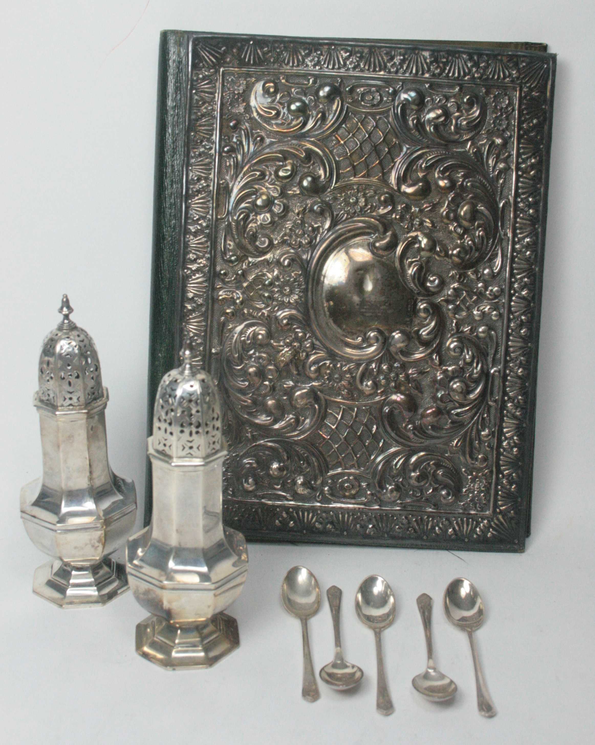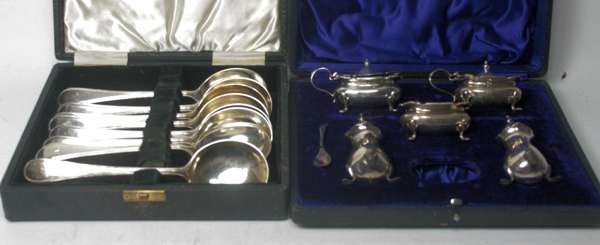 to include a cased condiment set; a cased set of eight soup spoons, various other cased tea spoons, a silver fronted desk blotter and a pair of sugar casters (qty)