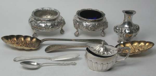to include various tea spoons, sugar tongs, open salts, napkin rings, a cigarette case, mustard pots and cased studs (qty)