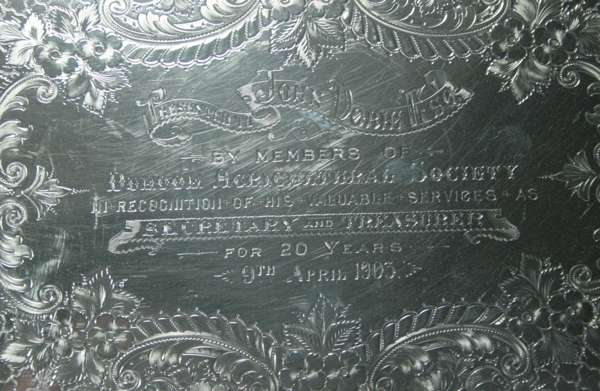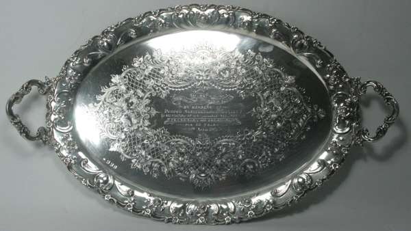 Glasgow 1902, of shaped oval outline with cast and chased floral border and twin loop handles, the central flat with large engraved floral display and presentation inscription