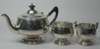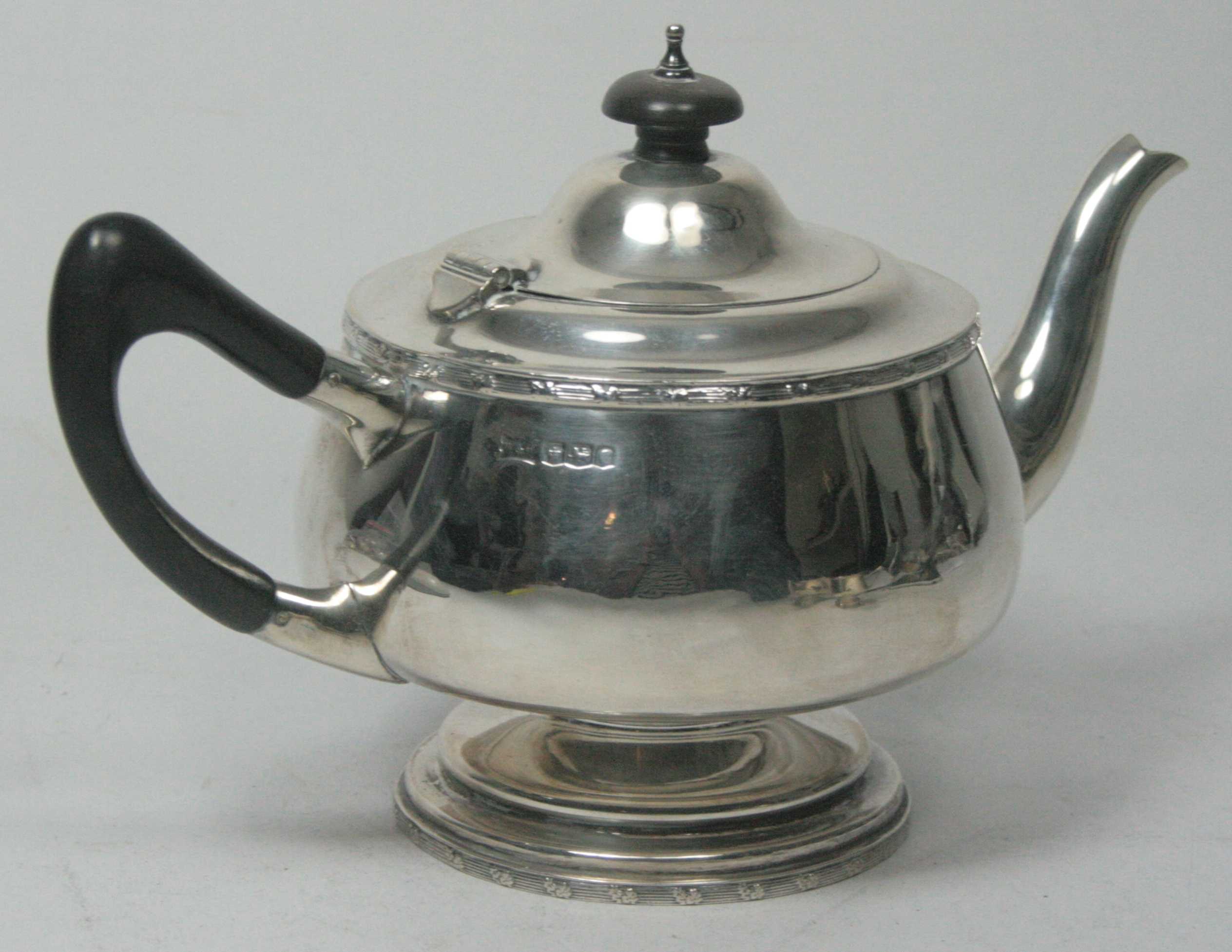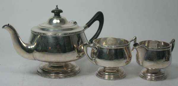 Walker and Hall, Sheffield 1956, comprising teapot, twin handled sugar bowl and milk jug, of plain bellied form with reeded and ribbon border (3)